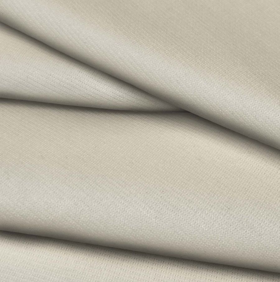 La tela base, Punto Roma Elástico - Lyon, es una tela de punto compuesta por 97% poliéster y 3% elastano, con un gramaje de 282 gr/m2 y un ancho de 150 cm. El color liso impreso en esta tela es una combinación de blanco y navajo, con un CMYK de 10 11 24 0. El color navajo es un tono terroso que evoca la naturaleza y la calidez, y se combina muy bien con colores como marrón, beige, verde y azul.