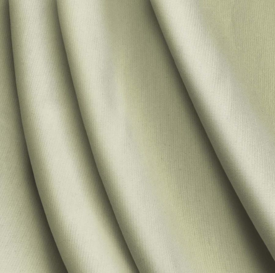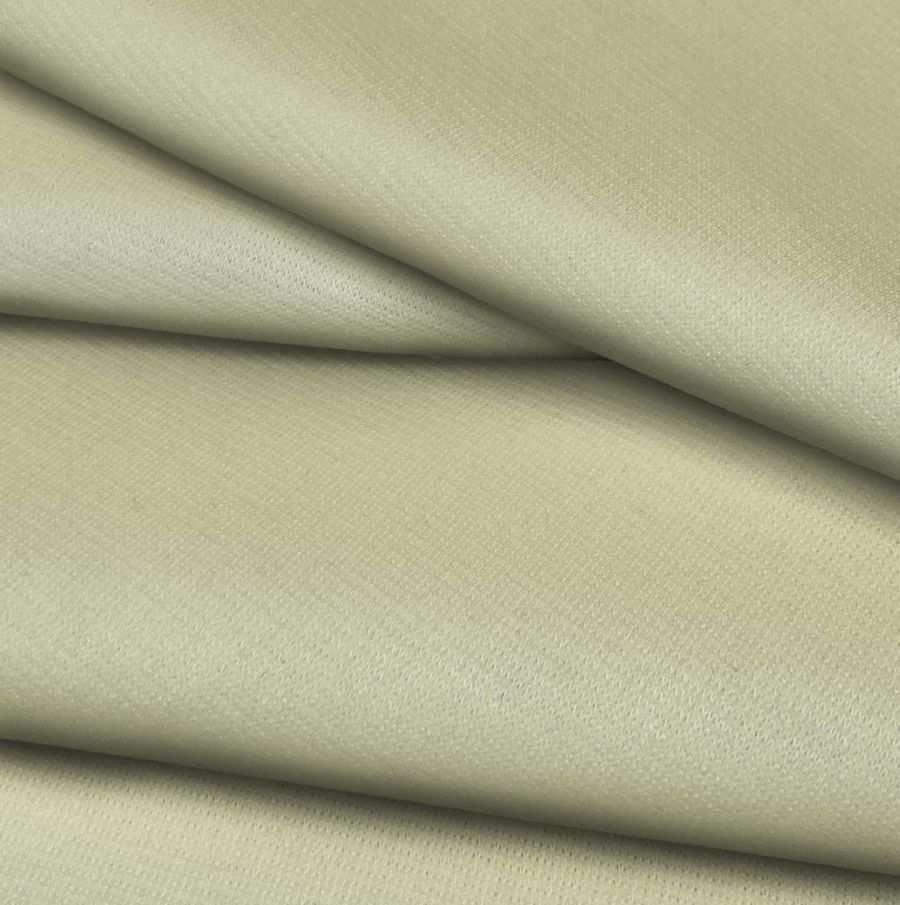 La tela base es el Punto Roma Elástico - Lyon, una tela de punto compuesta por un 97% de poliéster y un 3% de elastano, con un gramaje de 282 gr/m2 y un ancho de 150 cm. Su color liso impreso es una combinación entre verde y beige francés claro, con una tinta cyan de 20, una tinta magenta de 9, una tinta yellow de 41 y una tinta black de 0, lo que se traduce en un CMYK de 20 9 41 0. Este color secundario es una mezcla equilibrada entre un tono tierra y verde claro, lo que sugiere una sensación de equilibrio y armonía. Además, combina muy bien con tonos crema, beige, marrones claros y tonos neutros.