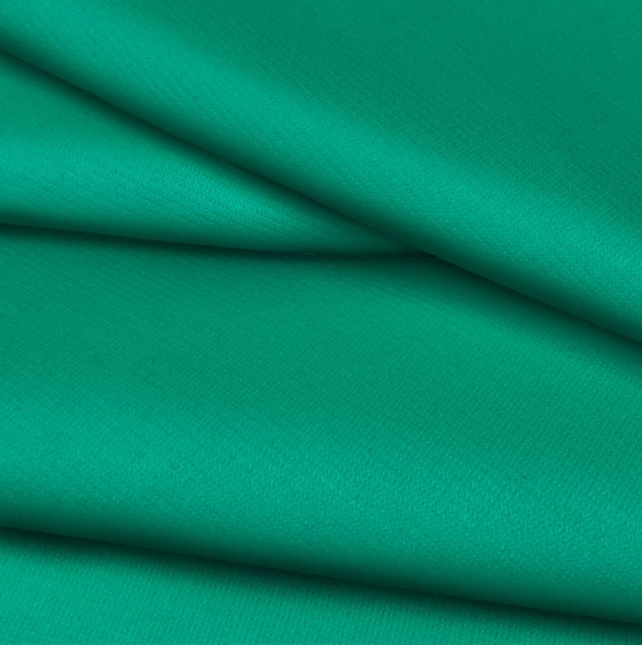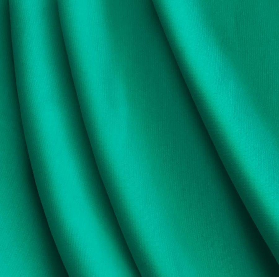 La tela base es Punto Roma Elástico - Lyon, compuesta por un 97% de poliéster y un 3% de elastano con un peso de 282 gr/m2 y un ancho de 150cm. El color liso impreso en esta tela tiene una tonalidad de verde esmeralda, que se consigue mediante una tinta Cyan del 81%, Magenta del 13%, Yellow del 65% y Black del 1%, con un CMYK de 81 13 65 1. El color verde esmeralda es un tono que transmite una sensación de frescura, calma y equilibrio, favorece la creatividad y se asocia con la naturaleza y la plenitud. Este color combina perfectamente con otros tonos de verdes más oscuros y grises, así como con colores neutros como el blanco o el negro.