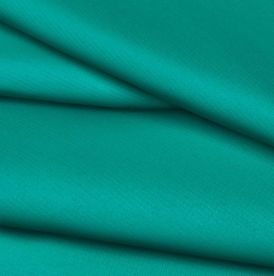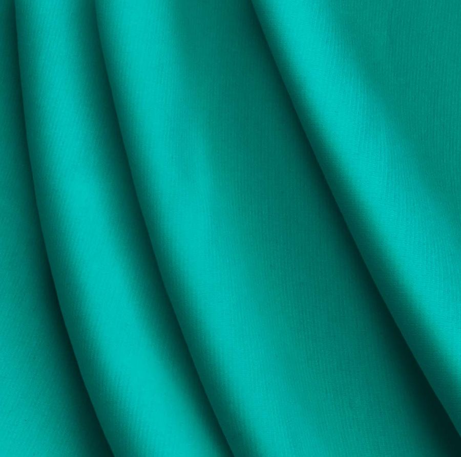 La tela base en cuestión es el Punto Roma Elástico - Lyon, una tela de punto con una composición de 97% poliéster y 3% elastano, con un gramaje de 282 gr/m2 y un ancho de 150 cm. En cuanto al color liso impreso, se trata de un verde azulado medio, con un contenido de CMYK de 80 13 52 1. Este color secundario resalta por ser calmado pero al mismo tiempo enérgico, simbolizando la naturaleza y la frescura. Este color se combina particularmente bien con tonalidades de marrón, rojo oscuro y rosa vieja. Es importante destacar que la tela base está impresa con el color liso a una sola cara por impresión digital textil, lo que significa que no es un tejido tintado, sino impreso por una sola cara.