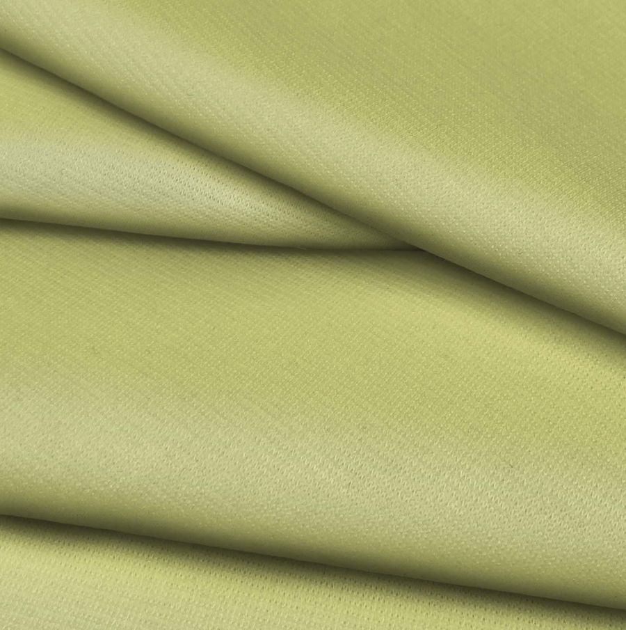La tela base es Punto Roma Elástico - Lyon, una tela de punto compuesta por un 97% de poliéster y un 3% de elastano, con un gramaje de 282 gr/m2 y un ancho de 150 cm. El color liso impreso es un verde uva espina, con tintas cyan: 23, magenta: 7, yellow: 62 y black: 0, reflejando un CMYK de 23 7 62 0.