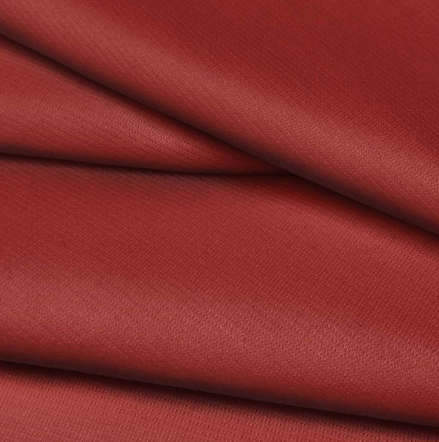 La tela base es Punto Roma Elástico-Lyon, una tela de punto compuesta por 97% poliéster y 3% de elastano, con un gramaje de 282 gr/m2 y un ancho de 150 cm. El color liso impreso es un rojo intenso, con tonalidades a Auburn, que se consigue mediante la técnica de sublimación, con los siguientes valores de CMYK: 27 93 84 29. El color es simbólico, representando la pasión y vitalidad, al igual que la confianza y fuerza en uno mismo del Auburn. Este tono combina perfectamente con colores neutros como blanco, negro y gris, pero también con tonos tierra como marrón y beige.