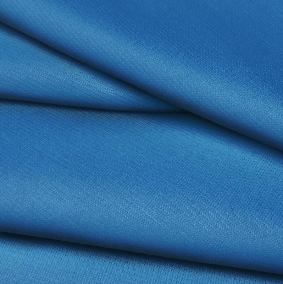 La tela base de este producto es un Punto Roma Elástico - Lyon, un tipo de tela de punto compuesta por 97% poliéster y 3% elastano de alto gramaje (282 gr/m2). El ancho de la tela es de 150 cm y su color liso impreso es Azul Celeste, con una tinta Cyan de 84, una tinta Magenta de 49, una tinta Yellow de 4 y una tinta Black de 0, lo que se traduce como un CMYK de 84 49 4 0.