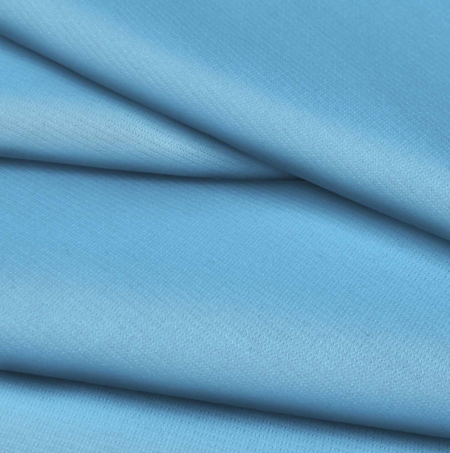 La tela base es la Punto Roma Elástico - Lyon, compuesta por un 97% de poliéster y un 3% de elastano, con un gramaje de 282 gr/m2 y un ancho de 150 cm. El color liso impreso es de un tono azul Frita, conforme al contenido del CMYK de 53 11 0 0, lo que indica que la tinta cian aporta mayoritariamente el tono, con un toque de magenta.