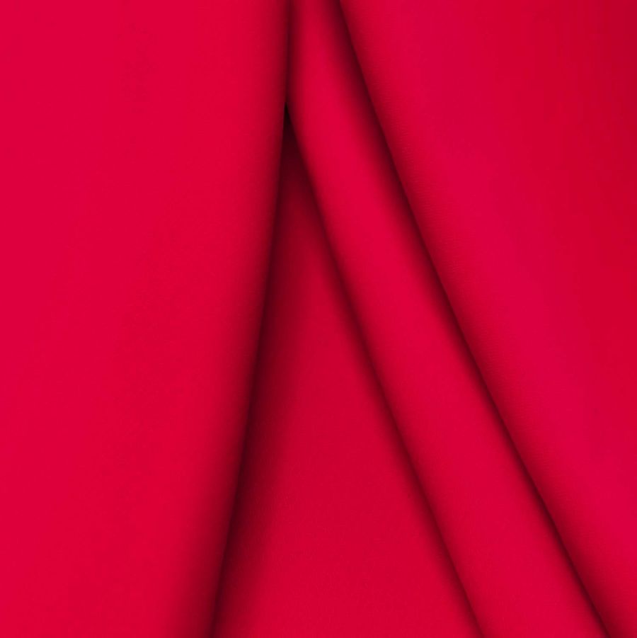 La tela base es el Punto Sintético con Spandex - Support, compuesta por 95% poliéster y 5% elastano, con un gramaje de 237 gr/m2 y un ancho de 152 cm. El color liso impreso de la tela es Rojo Carmín, con un CMYK de 0 100 77 0. Este color secundario refleja pasión, intensidad y energía, combinándose perfectamente con tonos blancos y negros para lograr un look sofisticado y elegante.