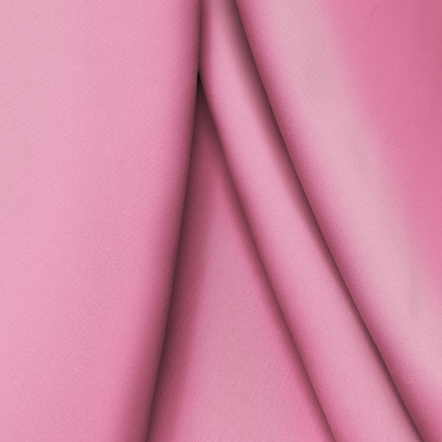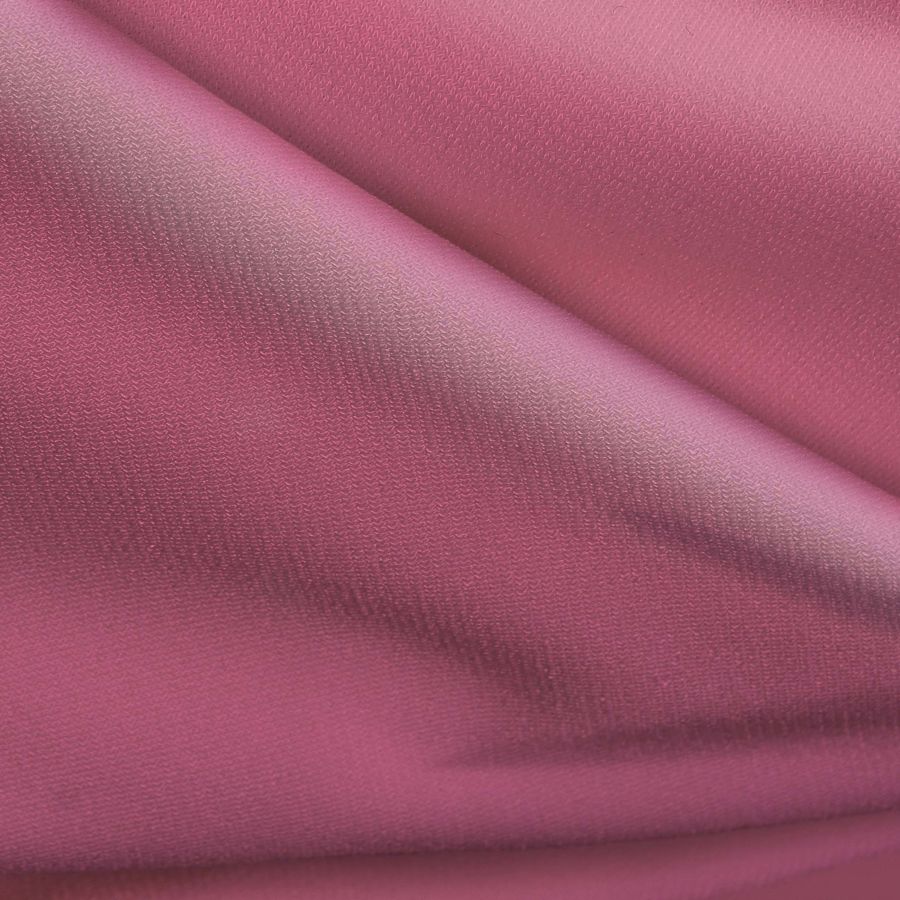 Esta es una tela de punto sintético con spandex llamada Support, con una composición del 95% de poliéster y un 5% de elastano, tiene un gramaje de 237 gr/m2 y un ancho de 152 cm. El color liso impreso es un rosa llamado Tickle me, con una combinación de tintas de 0% de cyan, 63% de magenta, 11% de amarillo y 0% de negro, obteniendo un CMYK de 0 63 11 0. Este color es simbólicamente cálido, evoca la felicidad y la fortaleza emocional, técnica y visualmente el color es opaco, suave al tacto y elástico, combinando perfectamente con tonos neutros, grises y marrones.