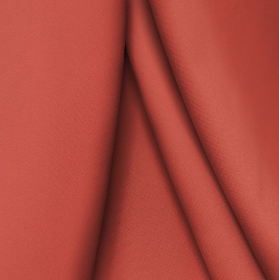 La tela base es el Punto Sintético con Spandex - Support, de composición 95% poliéster y 5% elastano, con un gramaje de 237 gr/m2 y un ancho de 152 cm. El color liso impreso es Marrón Ocre Rojo Luminoso, con un CMYK de 22 81 73 12, y tiene una textura opaca y elástica. Combinado con otros colores, armoniza bien con tonalidades como el beige, el burdeos y el verde oscuro.