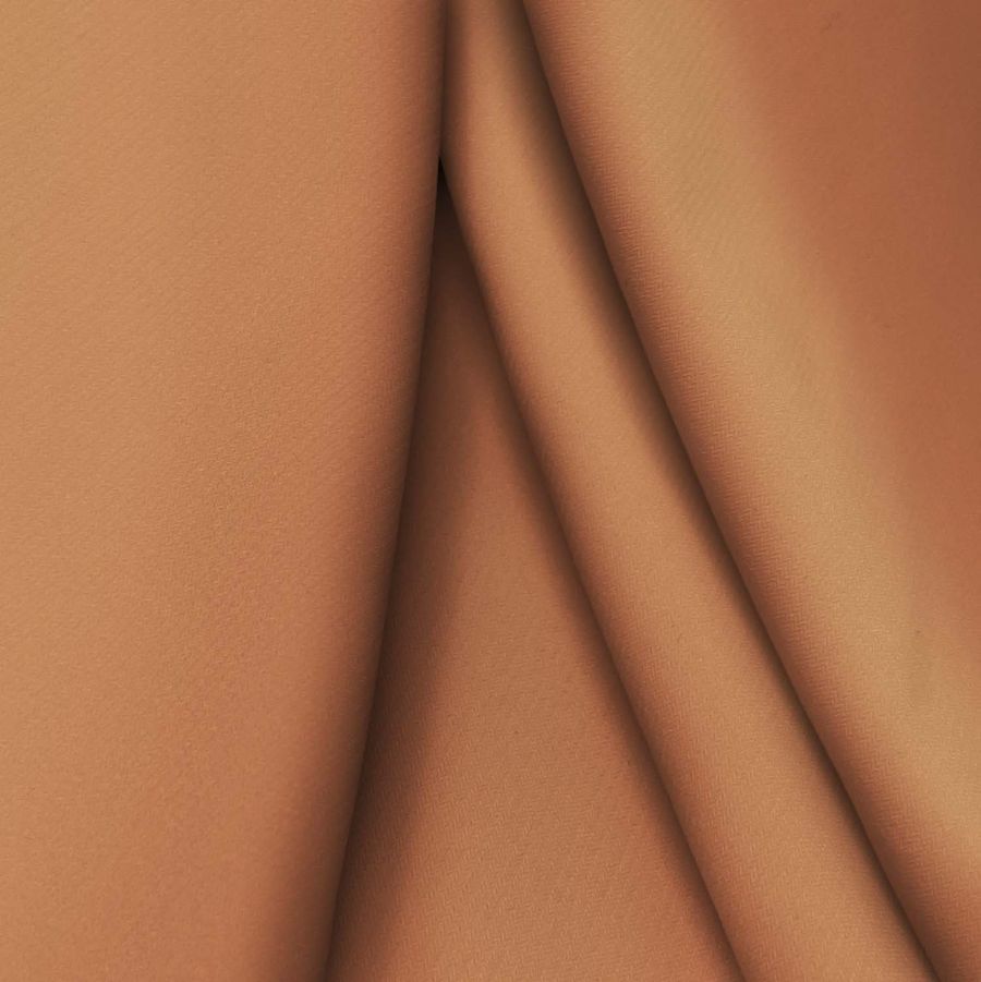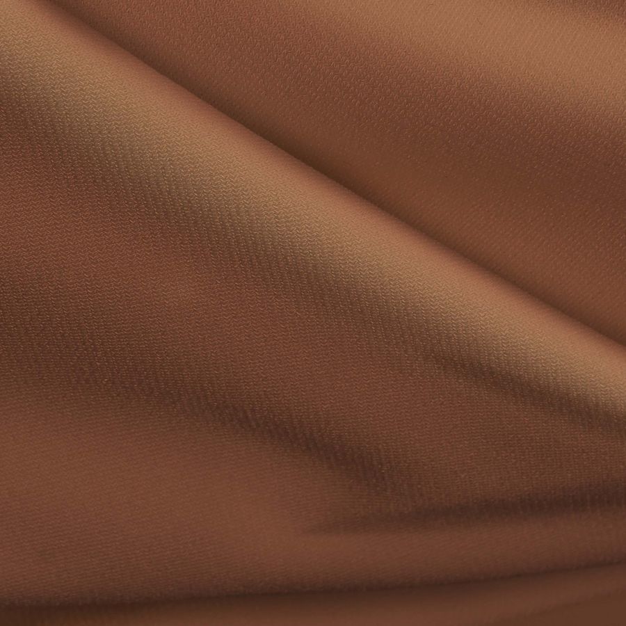La tela base, Punto Sintético con Spandex - Support, está compuesta por un 95% de poliéster y un 5% de elastano, lo que le confiere una textura suave y elástica. Tiene un gramaje de 237gr/m2 y un ancho de 152cm. El color liso impreso que se ha seleccionado para esta tela es de Marrón Terracota Oscuro, con una composición de tinta CMYK de 25 61 69 17. Este color se caracteriza por tener un tono cálido y atractivo, perfecto para prendas de moda tanto para mujer como para hombre. Su combinación con otros colores es versátil, encajando muy bien con tonos tierra, como beige o verde oscuro, así como con colores más vivos como el rojo, el naranja o el amarillo.