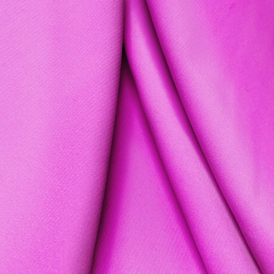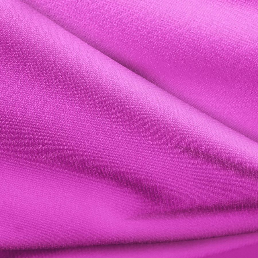 La tela base, Punto Sintético con Spandex - Support, es una tela de punto compuesta por un 95% de poliéster y un 5% de elastano, con un gramaje de 237 gr/m2 y un ancho de 152 cm. El color liso impreso es un morado dinámico con un CMYK de 24 72 0 0. La tinta cian y magenta se combinan para crear un tono vibrante y profundo, mientras que la ausencia de amarillo y negro permite que el morado sea el protagonista del diseño. Este color impreso combina bien con tonos claros como el rosa pastel y el beige claro, así como con colores más oscuros como el azul marino y el negro.