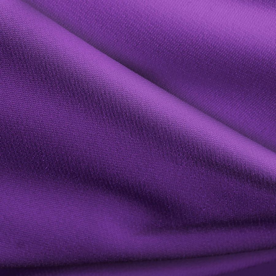 La tela base, Punto Sintético con Spandex - Support, cuenta con una composición del 95% poliéster y 5% elastano, con un gramaje de 237 gr/m2 y un ancho de 152 cm. El color liso impreso en esta tela es una combinación de morado y azul purpureo, con un CMYK de 78 99 3 0. La textura de la tela es suave al tacto y elástica, además de tener una apariencia opaca.