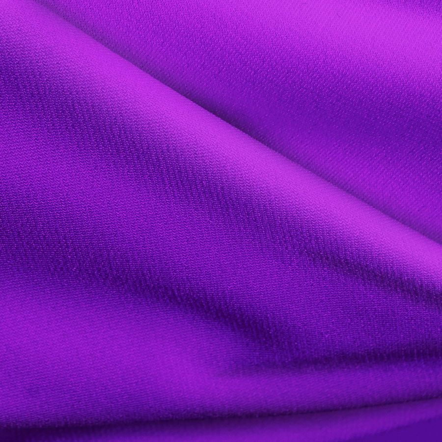 La tela base utilizada para este tejido es el Punto Sintético con Spandex - Support, compuesta mayormente por poliéster y elastano con un gramaje de 237 gr/m2 y un ancho de 152 cm. El color liso impreso en esta tela es un hermoso tono de Morado y Violeta Francés con un CMYK de 73 85 0 0. Este color refleja una mezcla perfecta entre el azul cian y el rojo magenta, creando así un tono profundo y vibrante. El color secundario de esta tela aporta una sensación de misterio, creatividad y una visión metafórica de la intuición y la iluminación. Este color combina perfectamente con tonos cálidos como el amarillo, el naranja y el rosa, creando un contraste impresionante.
