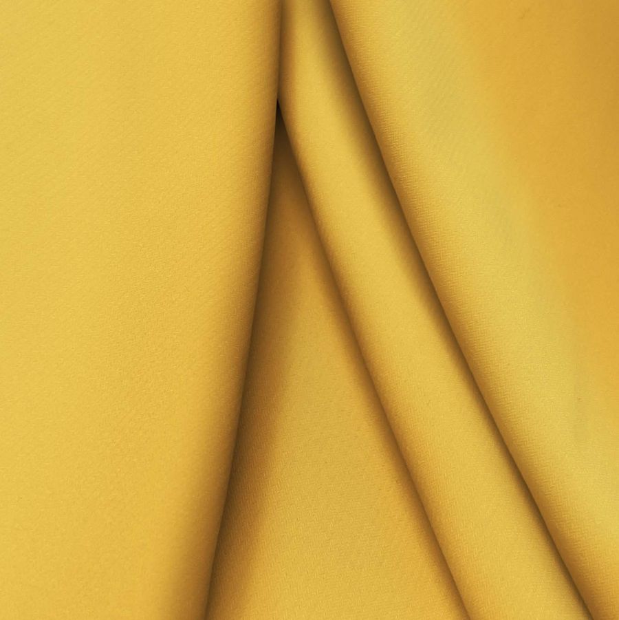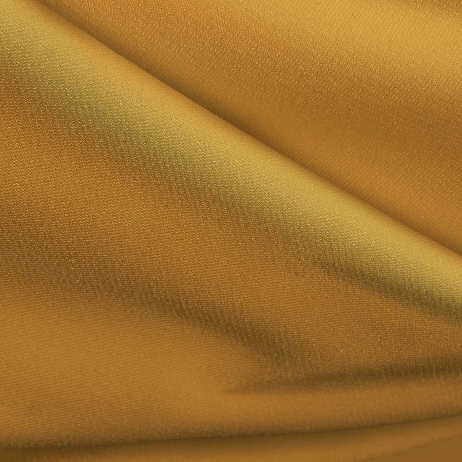 La tela base es el Punto Sintético con Spandex - Support, compuesta por 95% poliéster y 5% elastano, con un gramaje de 237 gr/m2 y ancho de 152 cm. El color liso impreso es un amarillo anaranjado, reflejado en el contenido del CMYK, con un 0 de tinta cyan, 38 de tinta magenta, 78 de tinta yellow y 0 de tinta black, lo que hace que obtengamos un color cálido y brillante. Este color secundario combina perfectamente con otro tipo de colores cálidos, como naranjas, rojos o rosas, realzando así su luminosidad.