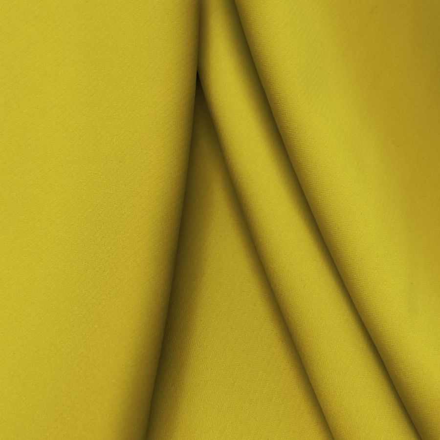 La tela base en cuestión es el Punto Sintético con Spandex - Support, un tejido de punto compuesto por un 95% de poliéster y un 5% de elastano, con un gramaje de 237 gr/m2 y un ancho de 152 cm. El color liso impreso es de un vibrante amarillo llamado Sahara, con una composición de tinta Cyan del 26%, tinta Magenta del 32%, tinta Yellow del 93% y tinta Black del 12%, tal y como indica el CMYK.