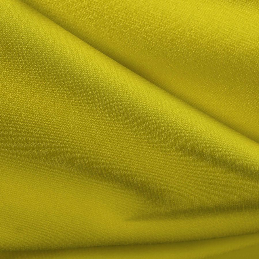 La tela base es el Punto Sintético con Spandex - Support de composición 95% poliéster y 5% elastano, con un gramaje de 237 gr/m2 y una anchura de 152 cm. Se presenta en color amarillo sólido impreso con una tecnología de sublimación, cuya tinta cian es de 3, magenta de 2, yellow de 88 y black de 0, por ende, se trata de un color amarillo vivo y brillante con un matiz cercano al mostaza. Combina muy bien con diversos tonos de gris, beige, negro y azul.
