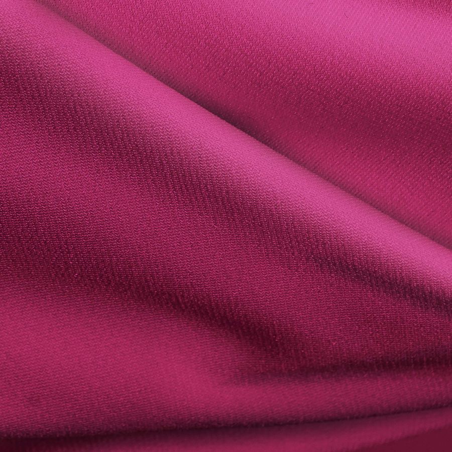 La tela base es suave, opaca y cuenta con una elasticidad, lo que la hace ideal para prendas ceñidas y ropa deportiva. Este tejido puede utilizarse para prendas íntimas, sujetadores, tops, y accesorios como coleteros o scrunchies. El color liso impreso se adhiere perfectamente al tejido base, creando un acabado vibrante e intenso, con una excelente durabilidad. Además del rojo carmín, este tejido también está disponible en otros colores.