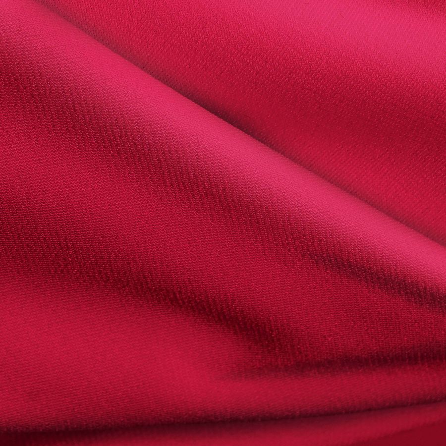 La tela base, Punto Sintético con Spandex - Support, tiene una composición de 95% poliéster y 5% elastano, lo que le confiere una textura suave, opaca y elástica. Su gramaje es de 237 gr/m2 y su ancho de tela es de 152 cm. El color liso impreso es Rojo Escarlata Gobelinos, con un CMYK de 18 100 77 8, lo que le da un aspecto vibrante y llamativo. Este color secundario combina especialmente bien con colores neutros como el blanco o el negro, y también con tonos tierra y naranjas.