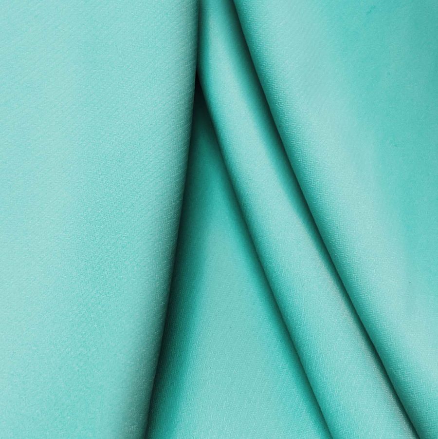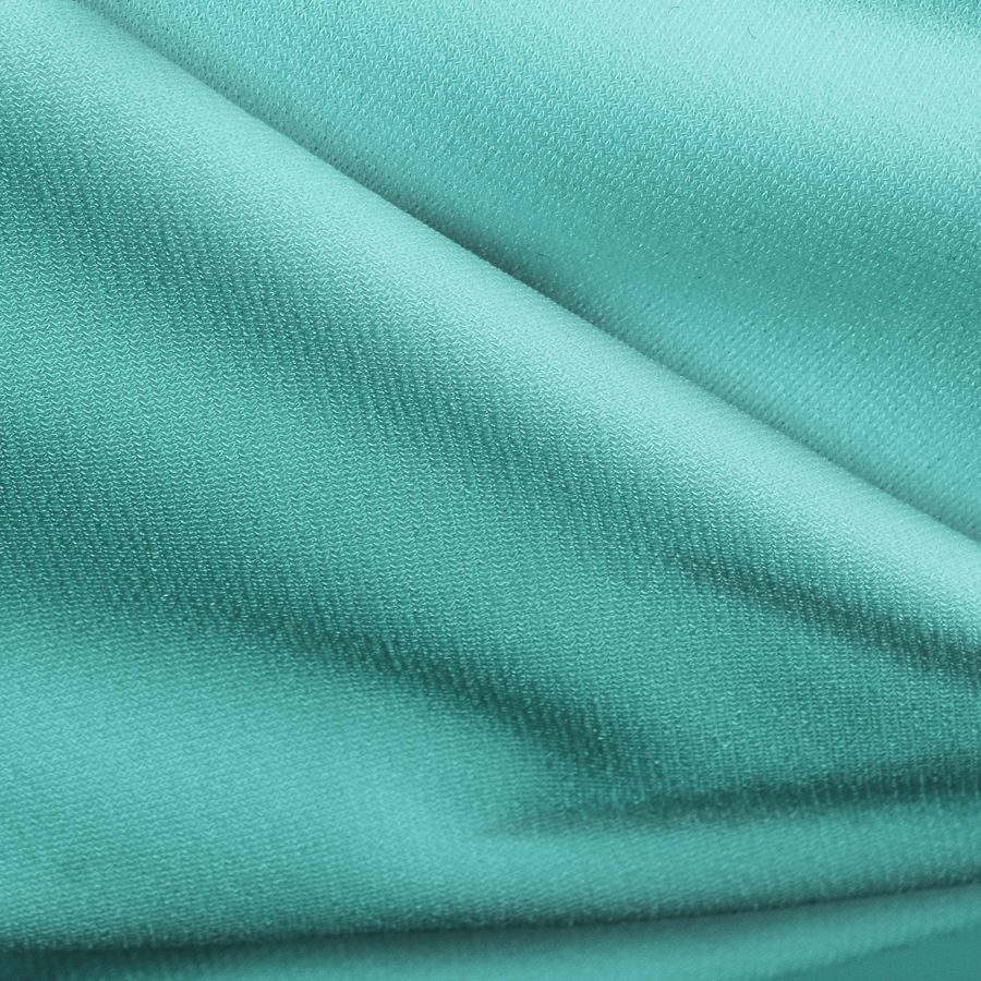 La tela base es el Punto Sintético con Spandex - Support, con una composición de 95% poliéster y 5% elastano, un gramaje de 237 gr/m2 y un ancho de 152 cm. Su color liso impreso es de un tono verde-turquesa visualmente opaco, con una tinta cyan de 62 y una tinta yellow de 33, sin tinta magenta ni negra en su composición, lo que sugiere un color fuerte y exótico.