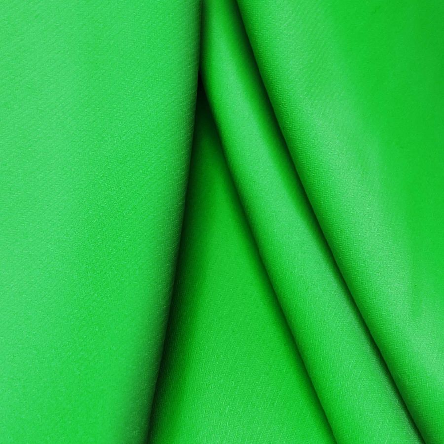 La tela base es Punto Sintético con Spandex - Support de composición 95% POLIÉSTER y 5% ELASTANO, con un gramaje de 237 gr/m2 y un ancho de 152 cm. El color liso impreso es un Verde brillante con un CMYK de 75 0 100 0. Su textura es suave, visualmente opaca y elástica al tacto. La tela está impresa con el color liso a una sola cara por impresión digital textil, no tintado.