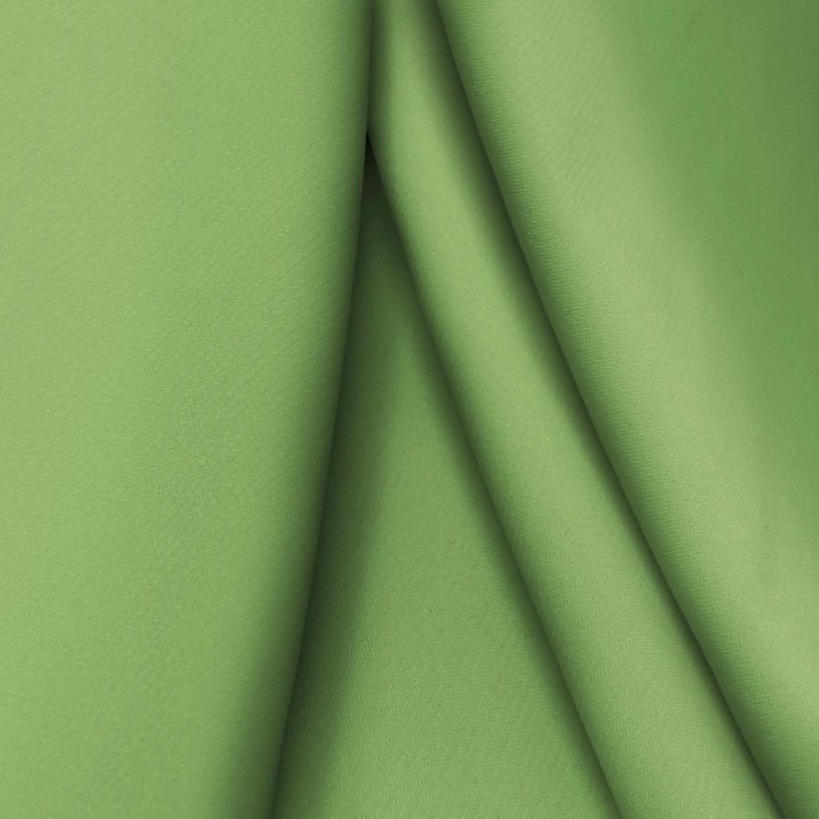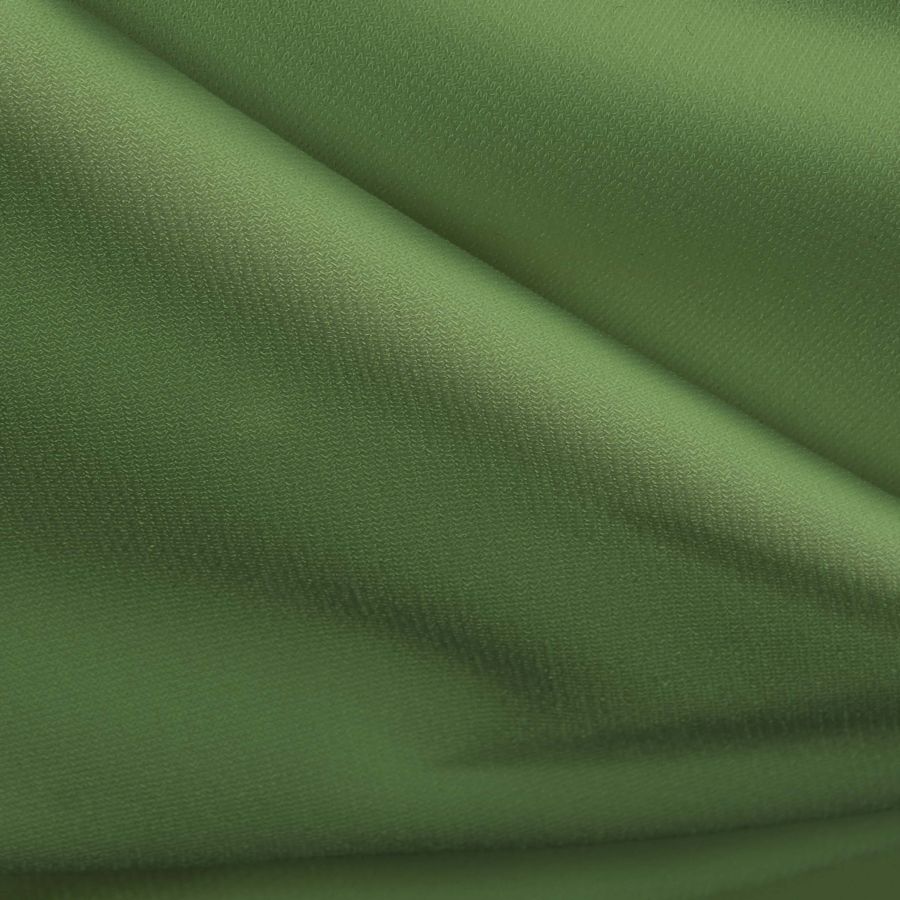 La tela base es el Punto Sintético con Spandex - Support, con una composición de 95% poliéster y 5% elastano, un gramaje de 237 gr/m2 y un ancho de 152 cm. El color liso impreso es un verde prado, con un CMYK de 61 22 77 5, y está impreso a una sola cara por impresión digital textil. La tonalidad del verde prado se caracteriza por tener un aspecto suave y visualmente opaco, mientras que su textura es elástica al tacto. Combina muy bien con colores discretos y tierra como el beige y el marrón, así como con tonos más fuertes, como el amarillo mostaza y el naranja.