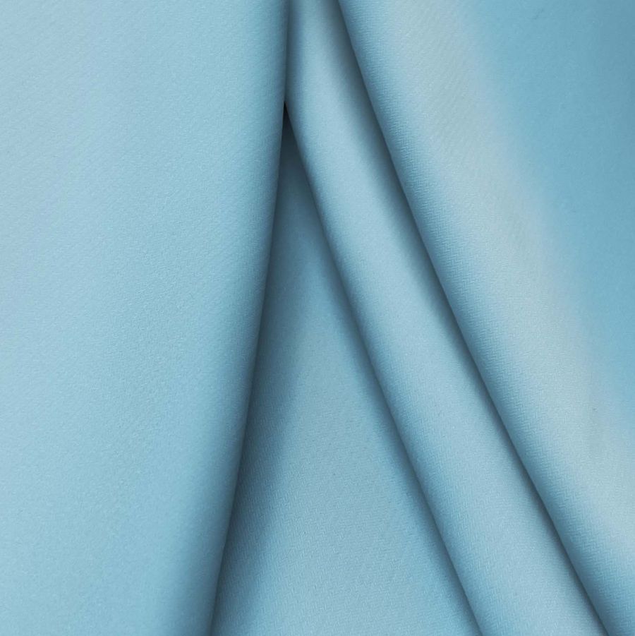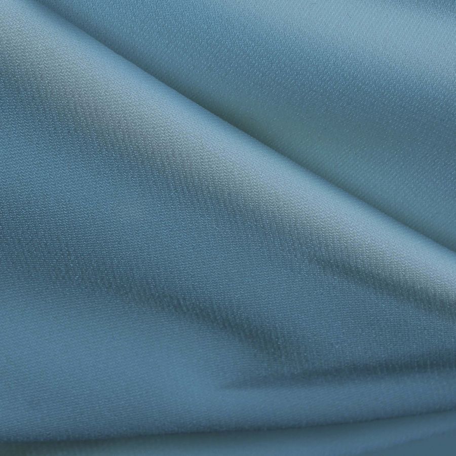 La tela base es Punto Sintético con Spandex - Support, de composición 95% poliéster y 5% elastano, con un gramaje de 237 gr/m2 y un ancho de 152 cm. El color liso impreso en esta tela es Azul Curaçao, cuyo CMYK es 54 15 10 0, lo que significa que tiene una alta proporción de cian y un bajo porcentaje de amarillo y magenta. Este color transmite calma, frescura, profundidad y confianza, se combina bien con otros colores como gris, blanco, negro y rosa pálido.