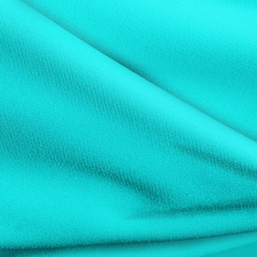 El Punto Sintético con Spandex - Support es una tela de punto compuesta por 95% poliéster y 5% elastano, que se presenta en rollo con un ancho de 152 cm y un gramaje de 237 gr/m2. El color liso impreso es un vibrante azul cian con un CMYK de 57 0 15 0 y una textura visual opaca y un tacto suave y elástico.