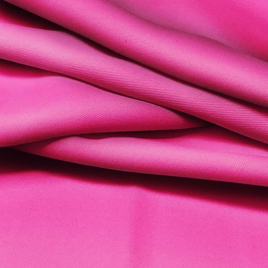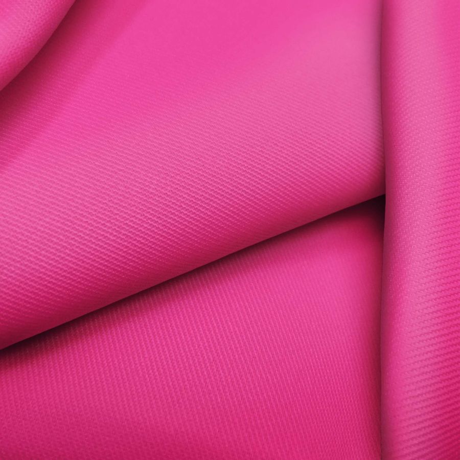 La tela base es una Sarga - Prada, compuesta por 96% de POLIÉSTER y 4% de ELASTANO, con un gramaje de 220 gr/m2 y un ancho de 150 cm. El color liso impreso es un rosa intenso, similar al color Barbie, con tinta Cyan y Yellow bajos y predominante tinta Magenta en el CMYK. Este color evoca la delicadeza y la feminidad, y combina especialmente con tonos neutros como blanco o beige.