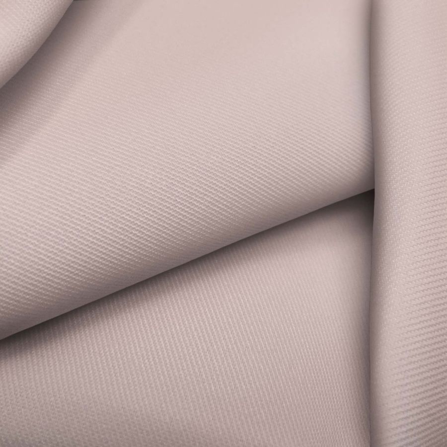 La tela base es una sarga de poliéster y elastano, con una composición del 96% y 4% respectivamente. Con un gramaje de 220 gr/m2, esta tela presenta una suavidad al tacto que se integra perfectamente con el delicado color rosa-oro rosa que se imprime con tecnología de sublimación (CMYK: 10 26 20 1). El resultado es un color liso con un matiz dulce y sutil, que combina perfectamente con tonos neutros y colores pastel.
