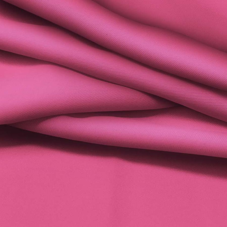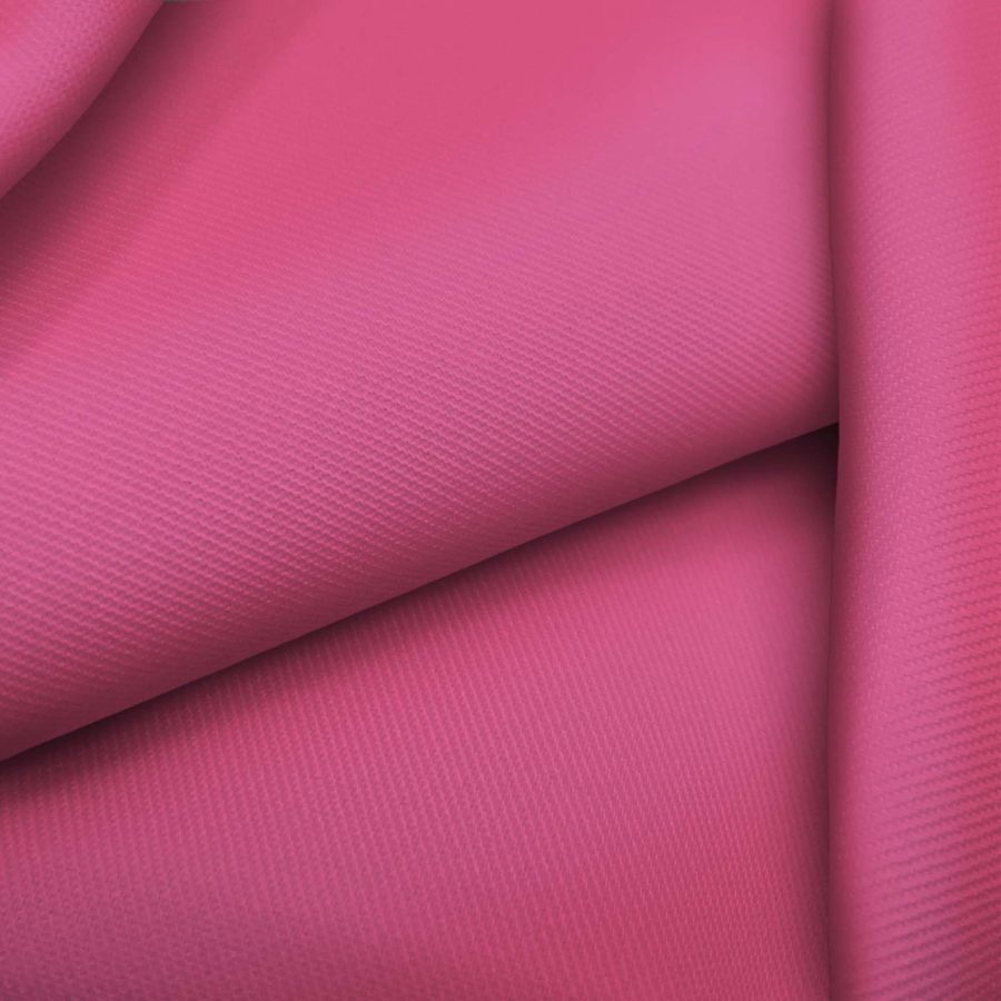 La tela base de esta prenda es una Sarga - Prada de 220 gr/m2, compuesta por 96% poliéster y 4% elastano, con un ancho de 150 cm. El color liso impreso es un rosa oscuro con un CMYK de 2 79 24 0. Este color secundario ofrece una sensación de elegancia, sofisticación y misterio, además de que combina perfectamente con tonos neutros como el negro y el blanco, así como con tonos más brillantes como el dorado o el plateado.