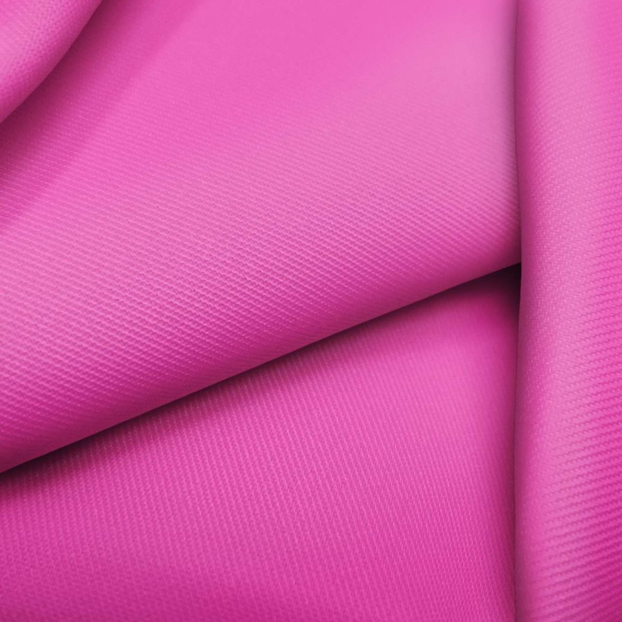 La tela base de esta prenda es de tipo sarga, compuesta por un 96% de poliéster y un 4% de elastano, de un gramaje de 220 gr/m2 y un ancho de 150 cm. En cuanto al color liso impreso, se trata de un rosa plástico con una tinta cian de 2 y una tinta magenta de 76, con un CMYK de 2 76 0 0, lo que produce un color vibrante y llamativo.