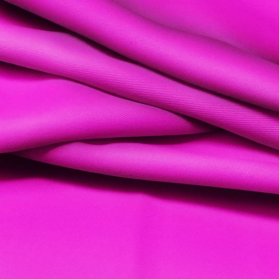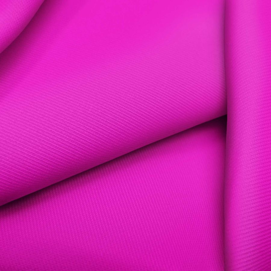 La tela base es una sarga de poliéster y elastano, con un gramaje de 220 gr/m2 y un ancho de 150 cm. El color liso impreso es rosa shocking con un CMYK de 22 83 0 0. Este color es vibrante y audaz, evocando energía y pasión. Se combina bien con tonos neutros como el blanco y el negro, así como con tonos análogos como el rojo y el naranja. El tejido está impreso con el color liso a una sola cara mediante impresión digital textil.