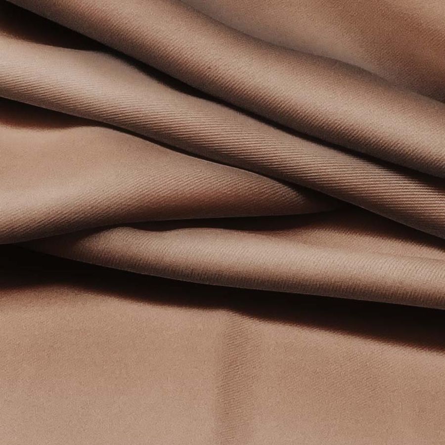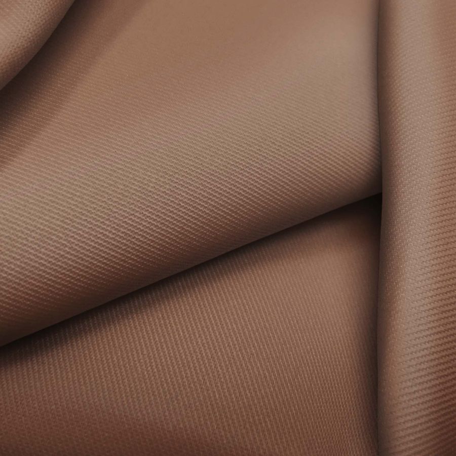 La tela base es una sarga de poliéster con un 4% de elastano, de 220 gr/m2 y 150 cm de ancho. El color liso impreso es marrón canela, con un CMYK de 35 55 61 39. Este tono es suave y cálido, y simboliza la calidez y confort. El color canela se puede combinar bien con tonos tierra y neutros, como el beige y el marrón, así como con un azul marino oscuro para crear una armoniosa paleta de colores.
