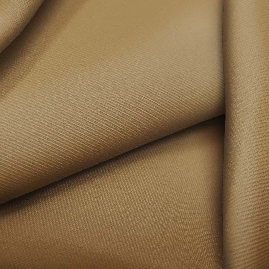 La tela base de este tejido es una sarga de composición 96% poliéster y 4% elastano, con un gramaje de 220 gr/m2 y un ancho de 150 cm. Su color liso impreso presenta tonos marrones con un matiz de cigarro puro, con una combinación de tintas CMYK de 33 46 71 28. Este color secundario transmite sobriedad y elegancia, y combina perfectamente con tonos tierra, verde oliva y otros colores neutros.