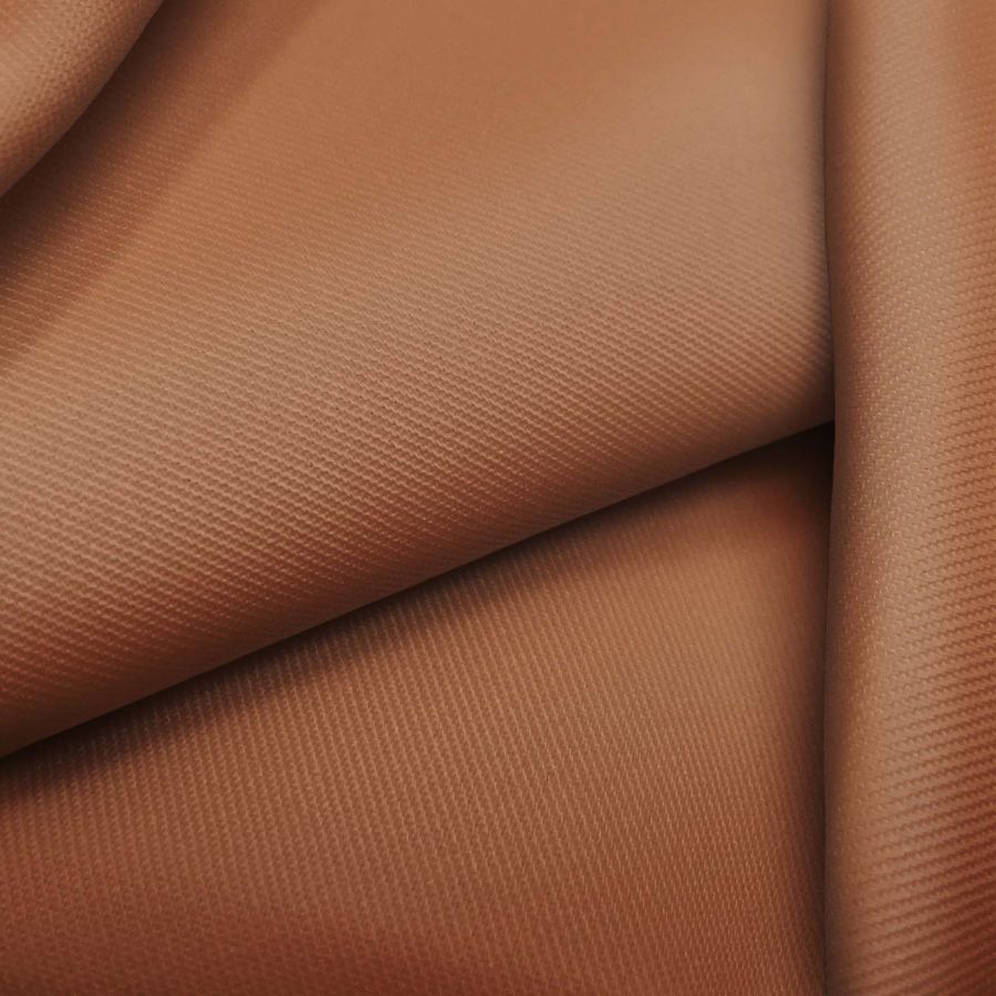 La tela base es Sarga-Prada, compuesta por un 96% de poliéster y un 4% de elastano, con un gramaje de 220 gr/m2 y una anchura de 150cm. El color liso impreso es marrón coñac, con un CMYK de 29 63 75 28. Este color transmite elegancia y sofisticación, y se combina especialmente bien con tonos beige, dorados y tierra. El tejido está impreso con este color liso a una sola cara mediante impresión digital textil. La textura y tacto de la tela son suaves y delgadas, lo que la hace perfecta para moda en verano.