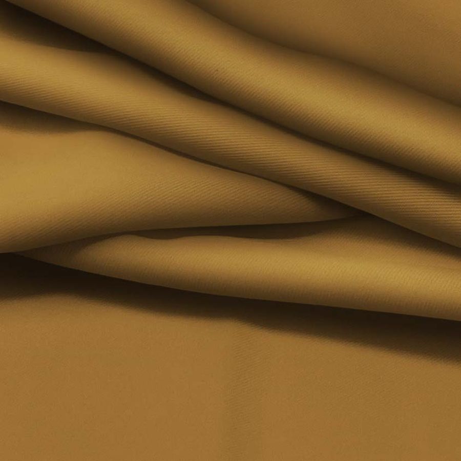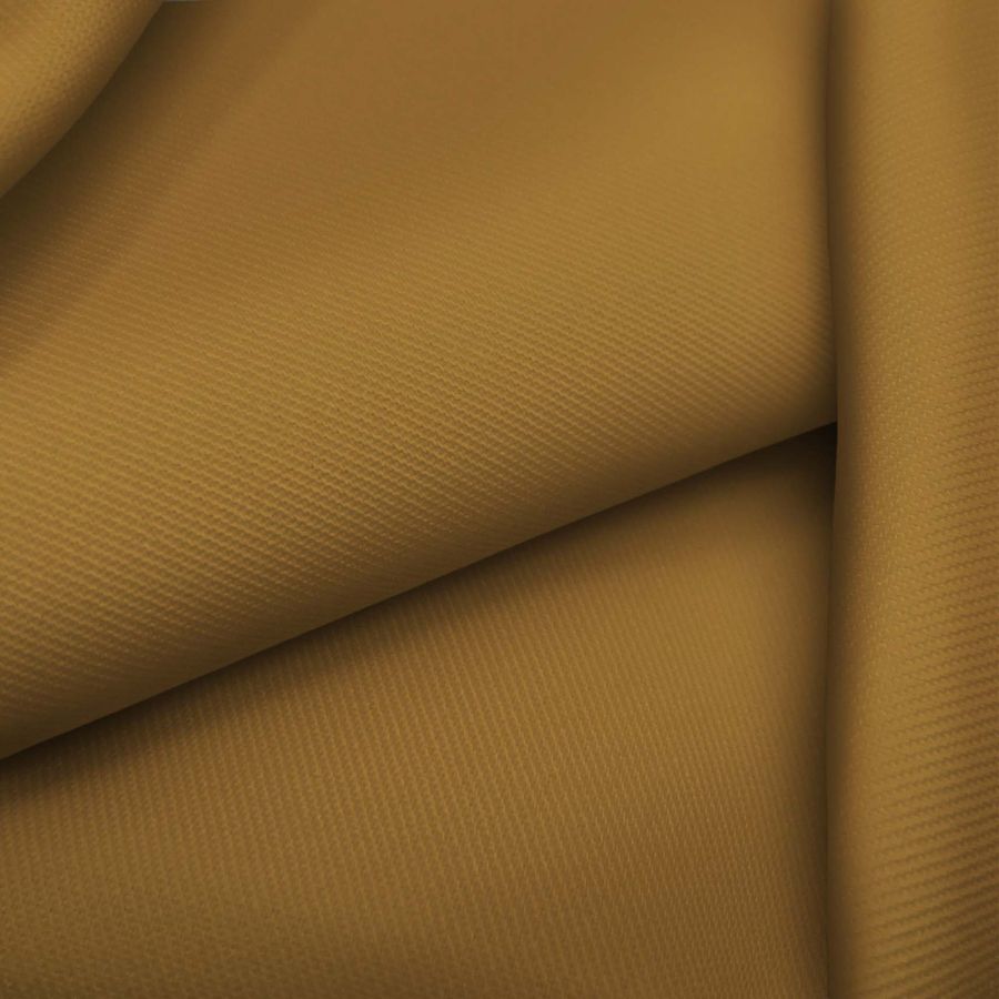 La tela base es la Sarga - Prada, compuesta en un 96% por poliéster y un 4% de elastano, con un gramaje de 220 gr/m2 y un ancho de 150 cm. El color liso impreso es una combinación de marrón y dorado, con los siguientes valores del CMYK: 31 52 84 30. La tonalidad marrón refleja estabilidad y confianza mientras que el tono dorado simboliza el éxito, la riqueza y el valor. Estos colores combinados crean una sensación de elegancia y sofisticación. El tejido está impreso con el color liso a una sola cara por impresión digital textil. Su textura es suave y delgada, lo que lo hace ideal para prendas de ropa que requieren movilidad y fluidez.