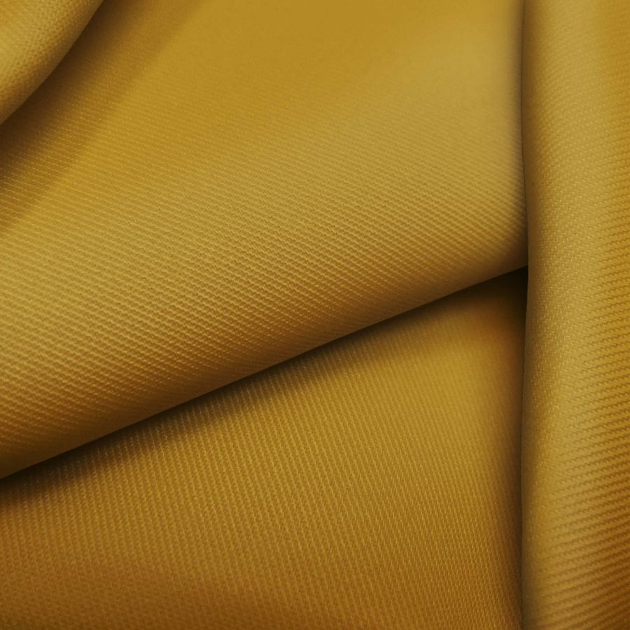 La tela base es la sarga Prada, compuesta por 96% de poliéster y 4% de elastano, con un gramaje de 220 gr/m2 y un ancho de 150 cm. El color liso impreso es marrón ocre amarillo con un CMYK de 28 49 100 22, lo que le da un aspecto cálido y terroso. Simbólicamente, este color puede representar la tierra, la estabilidad y la calidez. Técnicamente, el ocre amarillo es un color secundario hecho de mezclar naranja y amarillo. Combina bien con colores marrones, ocres, verdes oscuros y azules oscuros.