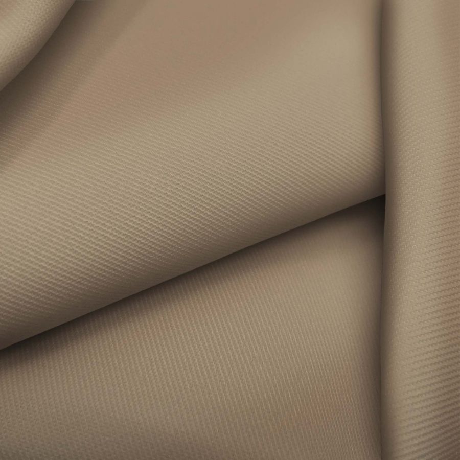 La tela base de esta prenda es una sarga de poliéster y elastano, de 220 gr/m2 de gramaje y un ancho de 150 cm. En cuanto al color liso impreso, destaca por su tonalidad marrón sándalo con una mezcla de tonos cian, magenta, amarillo y negro según el CMYK 32 39 52 21. Este color se percibe sutil y elegante, aportando una sensación de tranquilidad. Se combina muy bien con tonos beige, marrones y ocres, logrando una agradable armonía visual.