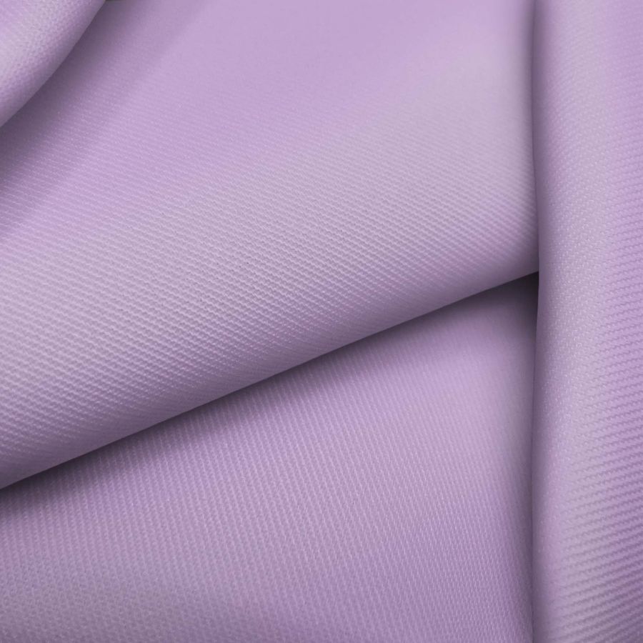 La tela base es una sarga de poliéster y elastano de 220 gr/m2 de gramaje y 150 cm de ancho. El color liso impreso en un solo lado es de tonos morado y violeta claro con una dominante de magenta y un CMYK de 24 39 0 0. En combinación, este color secundario combina bien con tonalidades neutras como gris, blanco o negro, o con tonalidades más vivas como azul cielo o verde oliva.