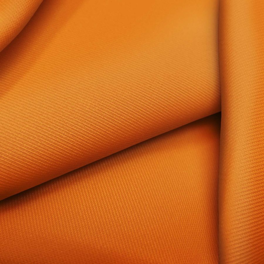 La tela base de este tejido es la Sarga - Prada, compuesta por un 96% de poliéster y un 4% de elastano, con un gramaje de 220 gr/m2 y un ancho de 150 cm. El color liso impreso es de un naranja aeroespacial con un CMYK de 0 69 100 0. Este color secundario simboliza la creatividad y la innovación, y combina perfectamente con tonos neutros como el blanco y el gris, así como con otros colores cálidos como el rojo y el amarillo.