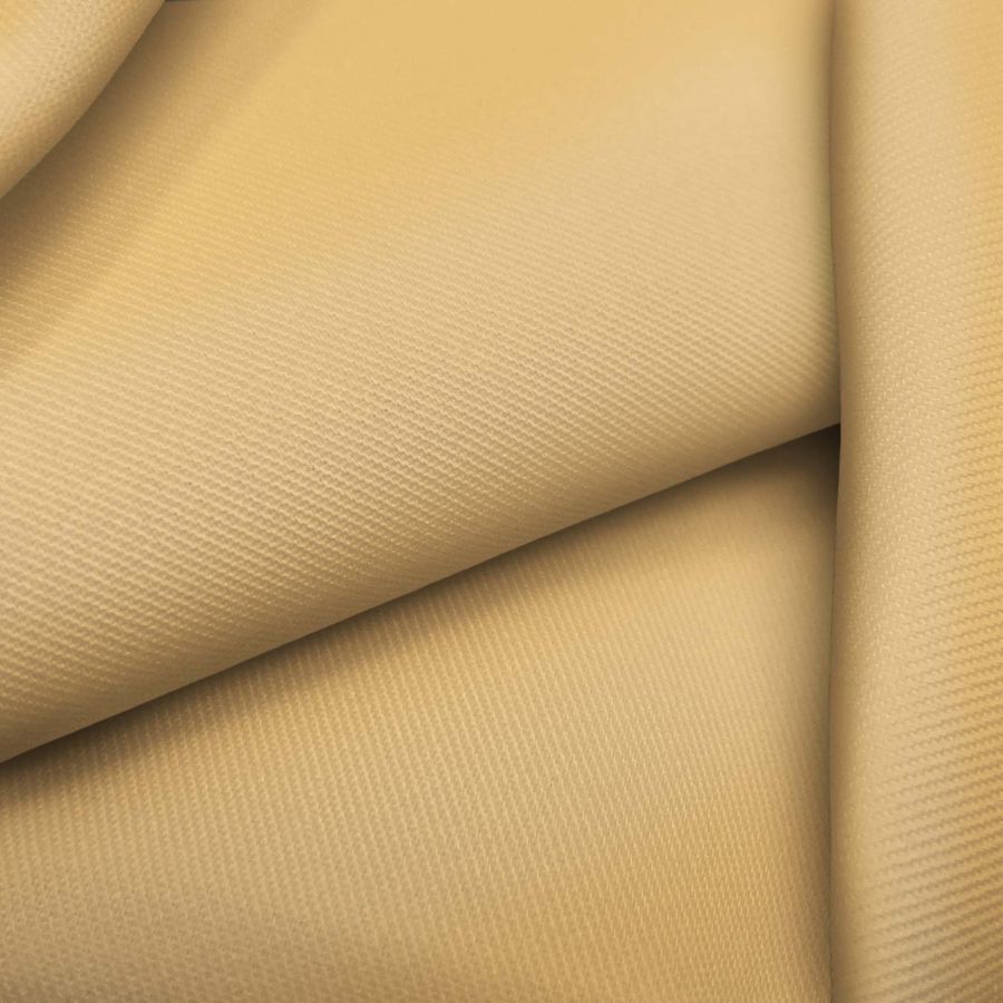 La tela base, Sarga - Prada, es una sarga suave y delgada compuesta por 96% poliéster y 4% elastano con un gramaje de 220 gr/m2 y un ancho de 150 cm. El color liso impreso en la tela es un amarillo macarrón con una combinación CMYK de 0 27 58 0. Este color secundario se caracteriza por ser alegre, luminoso y vibrante, transmitiendo una sensación de optimismo y energía. Su combinación con otros colores es muy versátil, pudiendo combinar perfectamente con tonos neutros como grises o blancos, así como con tonos más intensos como verdes o rosas.