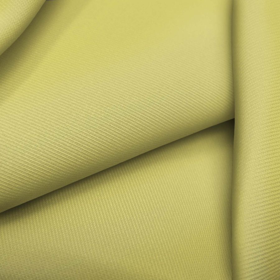 La tela base es una sarga de poliéster y elastano con un gramaje de 220 gr/m2 y una anchura de 150 cm. El color liso impreso es de un amarillo paja con una composición de 15% de tinta cyan, 8% de tinta magenta, 66% de tinta yellow y 0% de tinta black con un CMYK de 15 8 66 0. Este color secundario es suave y delicado, con un toque cálido y terroso que recuerda a la paja madura. Combina bien con tonos neutros como beige, marrón y blanco, así como con tonos más vivos como el naranja y el azul.