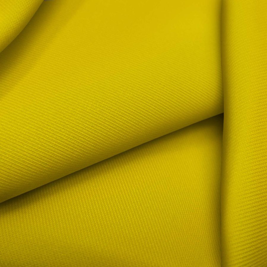 La tela base es una sarga Prada compuesta en un 96% de poliéster y un 4% de elastano, con un gramaje de 220 gr/m2, y un ancho de 150 cm. El color liso impreso es un vibrante amarillo señal, con un CMYK de 12 22 96 2. El color secundario de este amarillo es el verde lima, por lo que su combinación con otros verdes y amarillos puede enriquecer el diseño. Se debe tener en cuenta que la tela está impresa con el color liso a una sola cara por impresión digital textil, lo que permite una resolución nítida y clara.