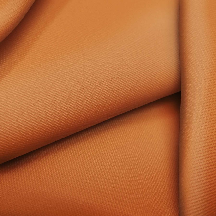 La tela base es la Sarga - Prada, compuesta por 96% de poliéster y 4% de elastano, con un gramaje de 220 gr/m2 y un ancho de 150 cm. El color liso impreso es Naranja Halloween con un CMYK de 16 66 89 5, lo que refleja un tono cálido y vibrante, perfecto para prendas de verano. Este color se combina especialmente bien con diferentes tonalidades de marrón, azul oscuro y verde.