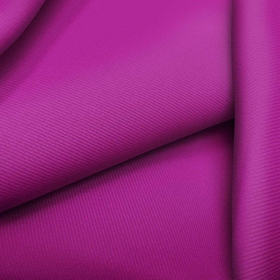 La tela base de esta descripción es la Sarga - Prada, que consta de un 96% de poliéster y un 4% de elastano con un gramaje de 220 gr/m2 y un ancho de 150 cm. El color liso impreso en esta tela es una combinación de rojo y púrpura rojizo, con un valor de CMYK de 44 100 2 0. Este color secundario simbólicamente representa la pasión, la emoción y la fuerza. Técnicamente, se trata de un color vibrante y opaco que combina en particular con tonos marrones y verdosos.
