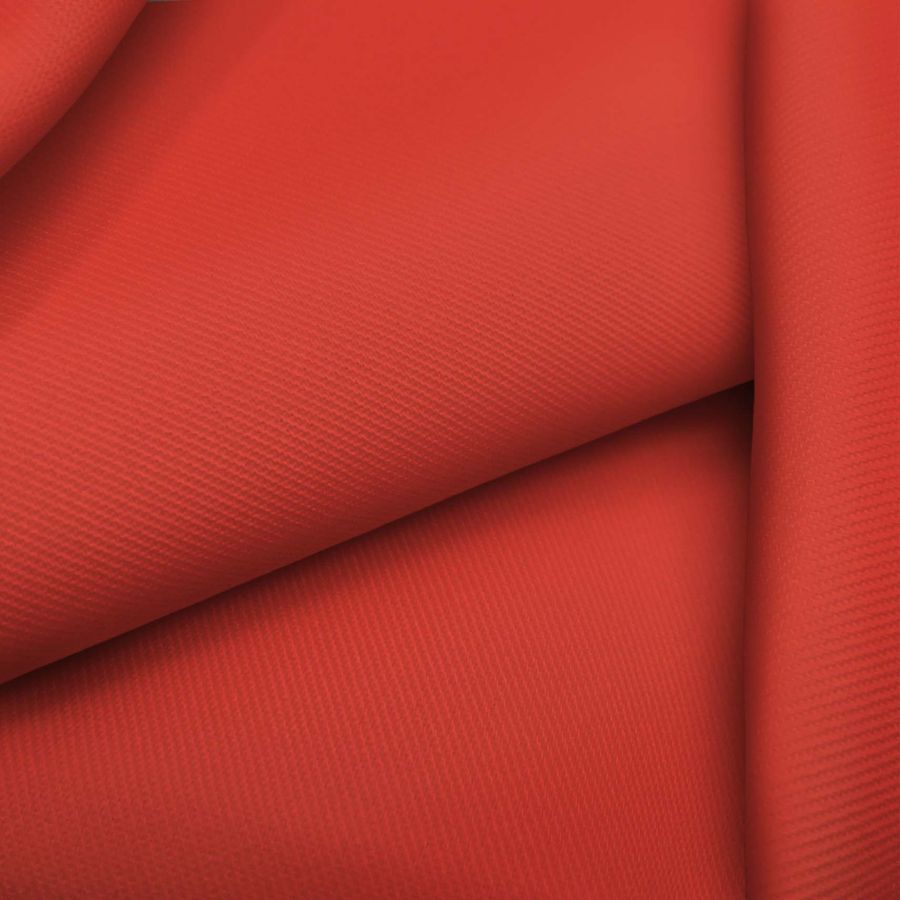 La tela base, Sarga - Prada, es una tela de sarga de 96% poliéster y 4% elastano con una densidad de 220 gr/m2 y un ancho de 150 cm. Su color liso impreso es Rojo,rojo CG con un CMYK de 5 87 82 0. Este color primario combina perfectamente con tonos azulados como cian y turquesa, logrando un contraste estilizado y brillante.
