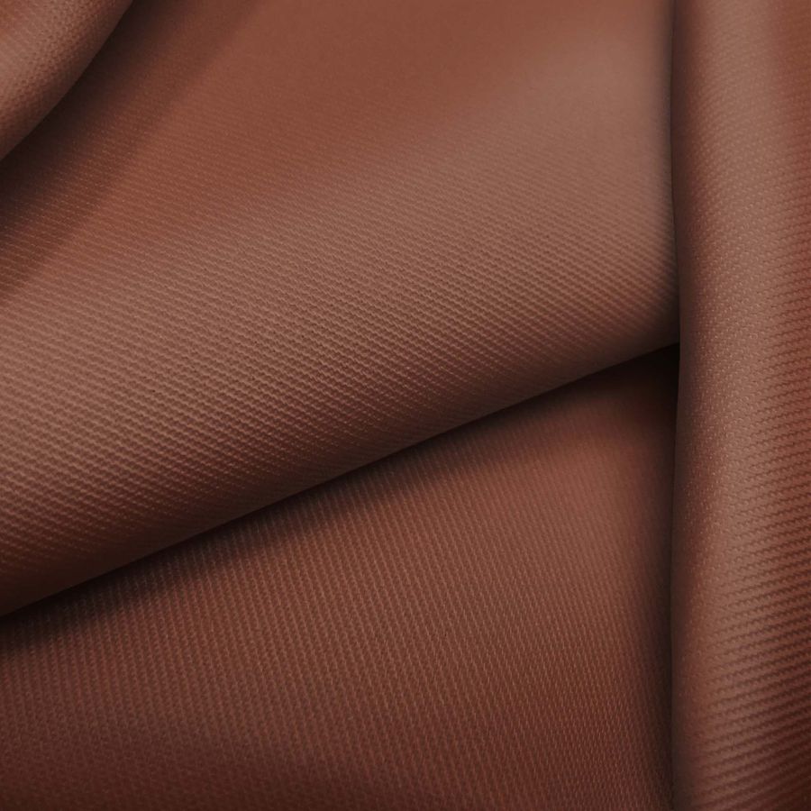 La tela base utilizada para esta prenda es la Sarga-Prada, de composición 96% poliéster y 4% elastano, con un gramaje de 220 gr/m2 y un ancho de 150 cm. El color liso impreso en la tela es rojo-marrón y está compuesto por 36% de tinta cian, 71% de tinta magenta, 75% de tinta yellow y 50% de tinta negra, lo que da como resultado un color intenso y sofisticado. El color secundario rojo-marrón transmite calidez y fuerza, y combina perfectamente con tonos cremosos, dorados, verdes y ocres.