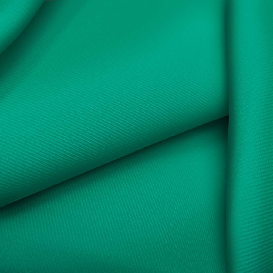 La tela base, sarga Prada, está compuesta por 96% poliéster y 4% elastano, con un gramaje de 220 gr/m2 y un ancho de 150 cm. El color liso impreso es en tonos de azul y esmeralda, y su CMYK es de 81-13-65-1. Este color primario se caracteriza por su simbolismo de tranquilidad y armonía, pero también por ser ardiente e intenso.