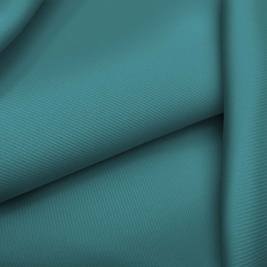 La tela base Sarga-Prada es una sarga compuesta por un 96% de poliéster y un 4% de elastano, con un gramaje de 220gr/m2 y un ancho de 150cm. El color liso impreso en esta tela es el Azul Laguna, con un CMYK de 75 33 43 18, lo que se traduce en un tono azul oscuro con un ligero toque de verde y una pequeña cantidad de negro. Este color sugiere tranquilidad, serenidad y frescura, evocando la belleza de un lago turquesa rodeado de naturaleza en verano.