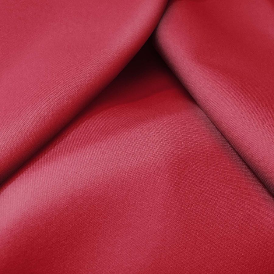 La tela base de este tejido es la Sarga Bielástica - Lisboa, que está compuesta por un 97% de poliéster y un 3% de elastano, lo que le confiere una textura suave y elástica al tacto. Su gramaje de 209 gr/m2 y su ancho de 150 cm lo hacen ideal para la confección de prendas de moda, como pantalones, faldas o vestidos, así como accesorios. El color liso impreso es un rojo escarlata con un CMYK de 24 98 73 20, lo que lo hace vibrante y expresivo. El color secundario que se destaca es el magenta, que aporta un toque de violeta al rojo, lo que lo hace combinable con tonos marrones, naranjas y verdes. La tela está impresa con el color liso a una sola cara por impresión digital textil.