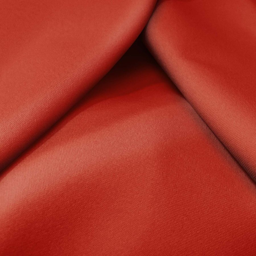 La tela base es la Sarga Bielástica - Lisboa, compuesta por 97% poliéster y 3% elastano, con un gramaje de 209 gr/m2 y un ancho de 150 cm. El color liso impreso es Rojo Ladrillo Refractario, con un CMYK de 23 97 100 19. Es un color cálido, que evoca la pasión y energía del fuego, combinando a la perfección con tonos neutros como el gris y beige, y con tonos más enérgicos como el verde esmeralda o el azul cobalto. La tela está impresa a una sola cara por impresión digital textil, lo que significa que el color no se tintó sino que se imprimió directamente sobre la tela.