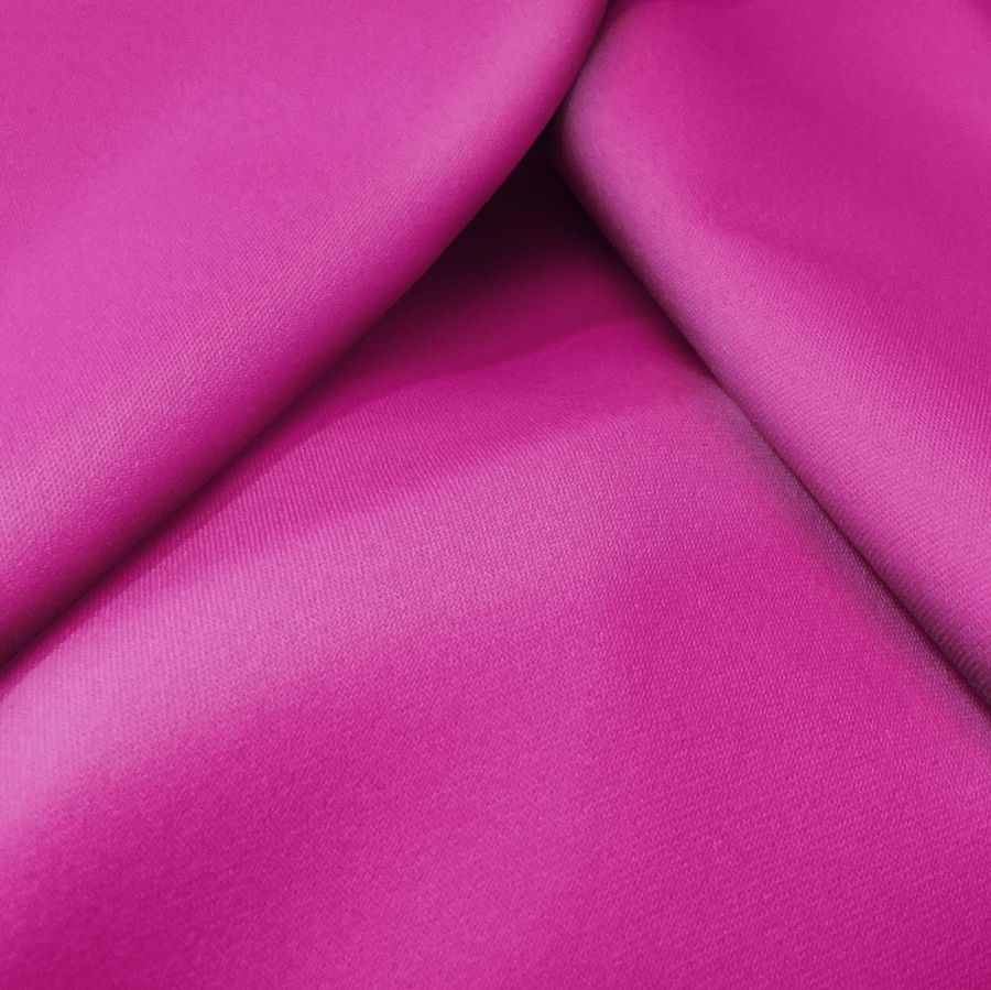 La tela base, Sarga Bielástica - Lisboa, es de composición 97% poliéster y 3% elastano, con un gramaje de 209 gr/m2 y un ancho de 150 cm. Su color liso impreso es de tonalidad rosa clavel, con una combinación de tintas CMYK 24 94 2 0. El color secundario se define por su delicadeza y suavidad, con un tono rosado y un toque levemente almendrado. Este nuance rosado se combina particularmente bien con tonalidades blancas, grises y negras, y se integra perfectamente en diseños de estilo romántico, vintage o bohemio.